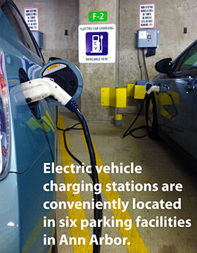 There are 21 electric vehicle charging stations throughout the public parking system in downtown Ann Arbor. Currently, there is no additional charge to plug into these charging stations.